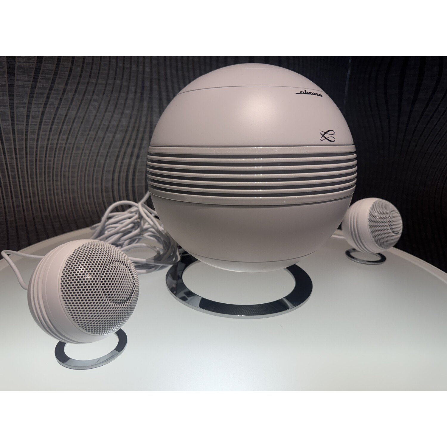 The satellite speakers and subwoofer have been designed to sit suspended in the air supported by a rough-cut chrome-plated steel base.