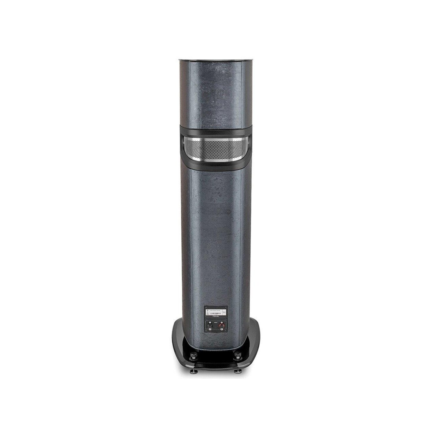 The main theme of Sopra is deliberately uncluttered, though it still offers connoisseurs the opportunity to enjoy all the small details. The grille with an incremental meshing motif protects the Beryllium tweeter and gives it a strong identity. This motif is repeated for sealing the curved back panel of the middle section. The terminal board, the thumb nuts and the adjustable spikes have all been specially designed for Sopra, as have the few visible screws, all of which were manufactured by watchmaking experts.The design agency Pineau & Le Porcher designed Sopra with one rule : no sacrifice of performance to aesthetics. The Sopra line is destined for the most passionate sound enthusiasts. Its design favors performance, whilst bringing together the qualities expected of an object which will be integrated into very elegant interiors and décors. Lacquered or bloodwood finishes are associated to noble materials to create an elegant line. Substantial efforts were made to give the front a tidy appearance, particularly around the speaker drivers, to iron out any aspects which could afflict the acoustics or the appearance. Sopra’s very structure is articulated around the intermediate section. This injected polyurethane component allows for the upper and lower cabinets to be inclined for the "Focus Time" ( acoustic convergence of the channels ).