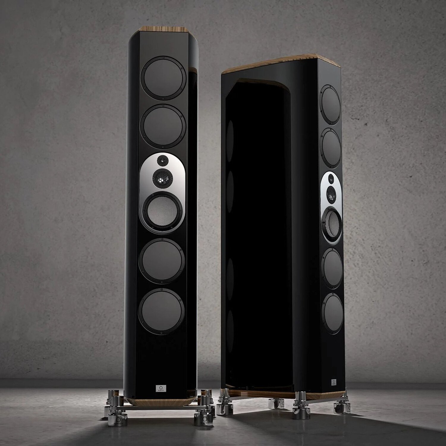 Mingus Orchestra’s dramatic cabinet is finished in Piano Black, with solid wood tops and bottoms handmade by local craftsmen in Sweden.