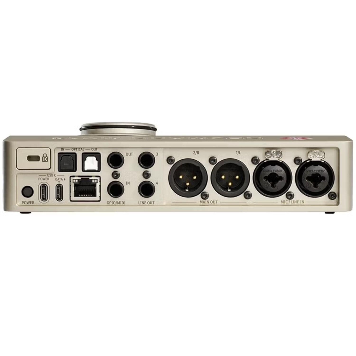 Thanks to Neumann's partnership with Merging Technologies, there are several surprises waiting on the rear of the MT 48, enabling it to expand from a simple desktop system to become the heart of a much larger recording studio. To start, ADAT optical I/O makes it easy to add an extra eight inputs with any external mic pre with ADAT optical connections. MIDI I/O is available through an optional TRS–DIN5 expansion cable (sold separately) from 1/4" TRS jacks that also provide general purpose I/O for external accessories like footswitches. The big expansion power, though, comes from the RJ-45 jack on the rear, which supports the Dante (AES67) digital audio standard, offering the capability of creating large digital audio networks.
