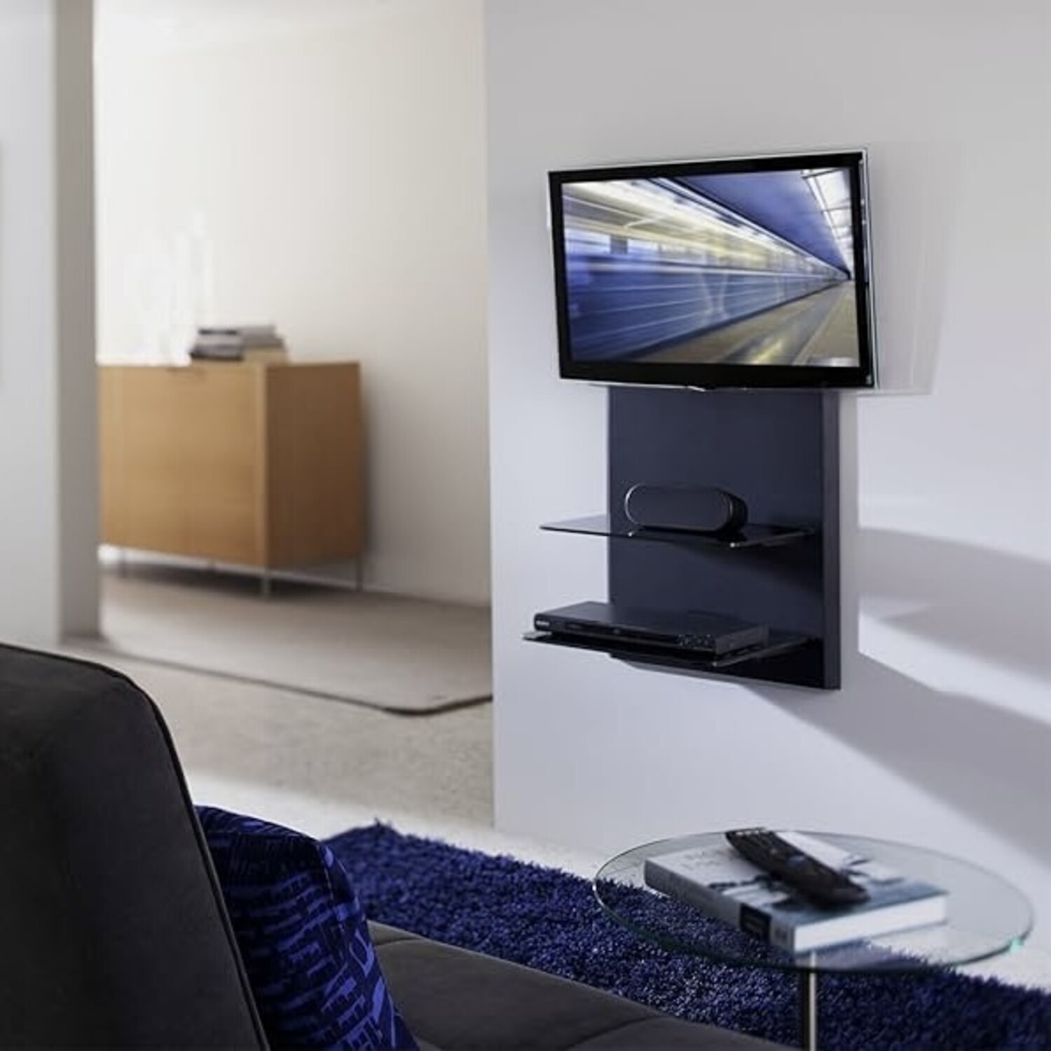 Mounted under a TV or as a stand-alone piece, the Blade2 2-Shelf Wall System from OmniMount is a low profile 2-shelf wall unit that provides hassle-free cable and component management. Its low profile lets you mount it directly underneath a flatpanel TV while maintaining a seamless appearance. The satin black finish is paintable to match any wall color.