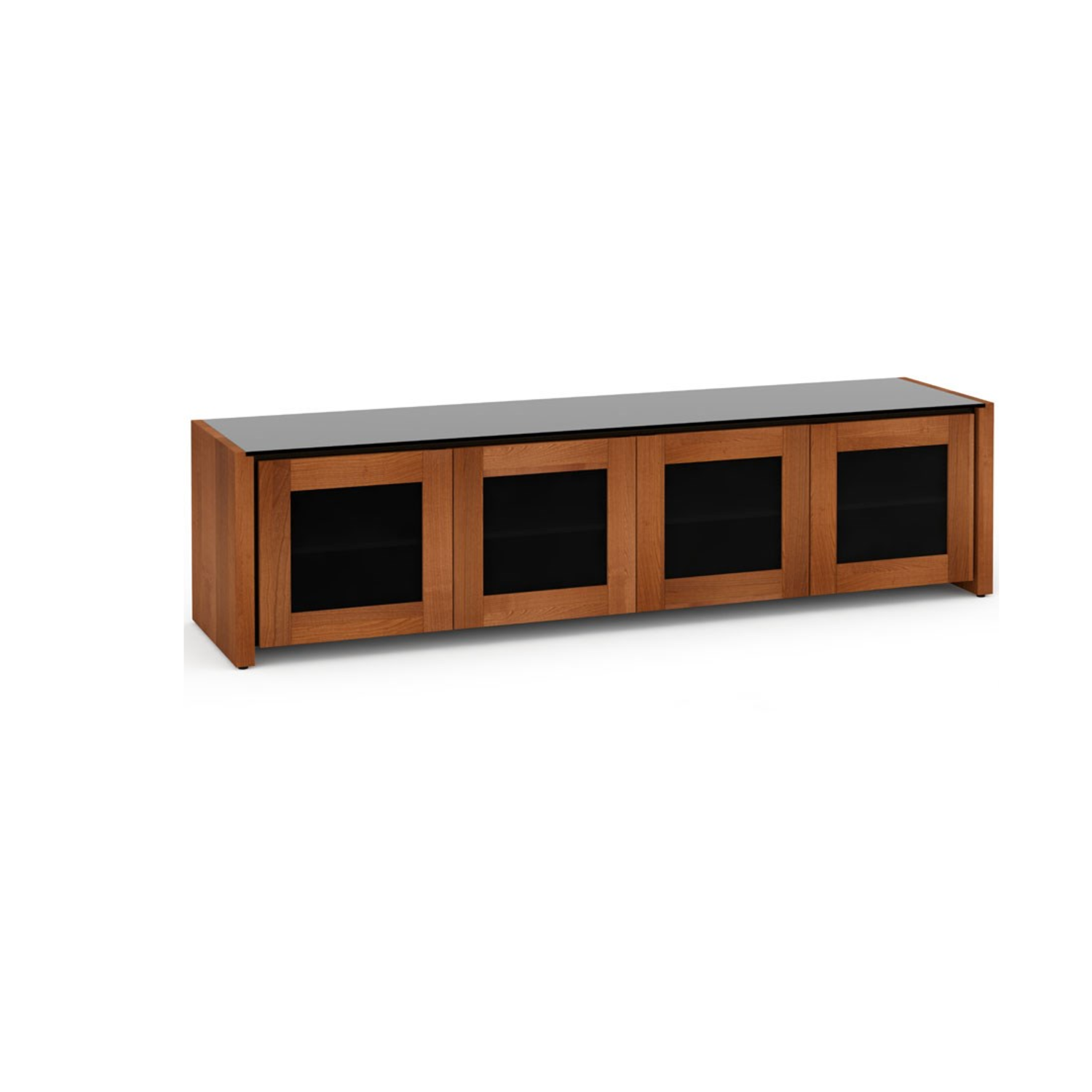- American cherry finish, wood framed smoked glass door w/ hidden finger pull & black glass top