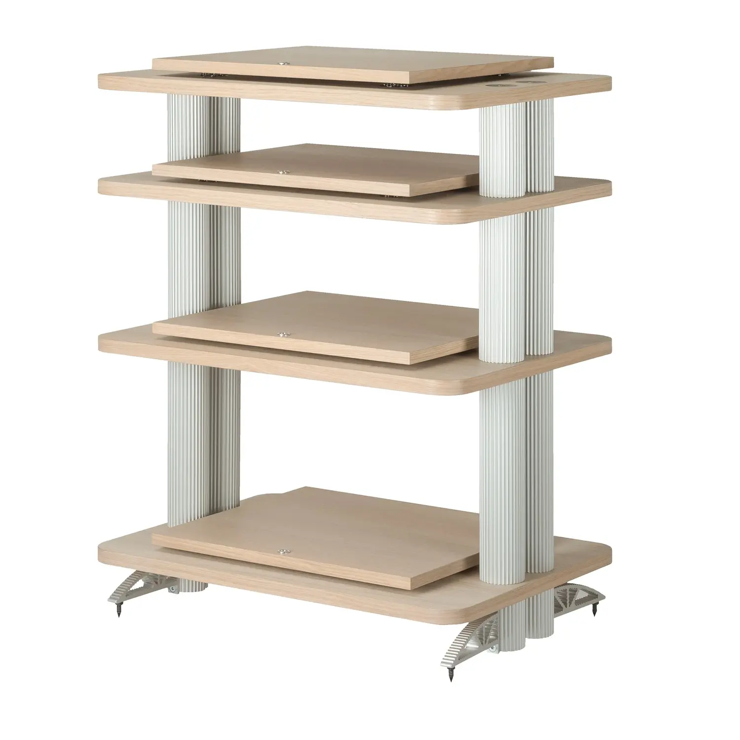 Balance with its retracted corner pillars are designed to primarily give as much highlight to the equipment as possible. The shelves are made of waxed oak to preserve the natural wooden feel and corner posts in black or silver anodized aluminum.