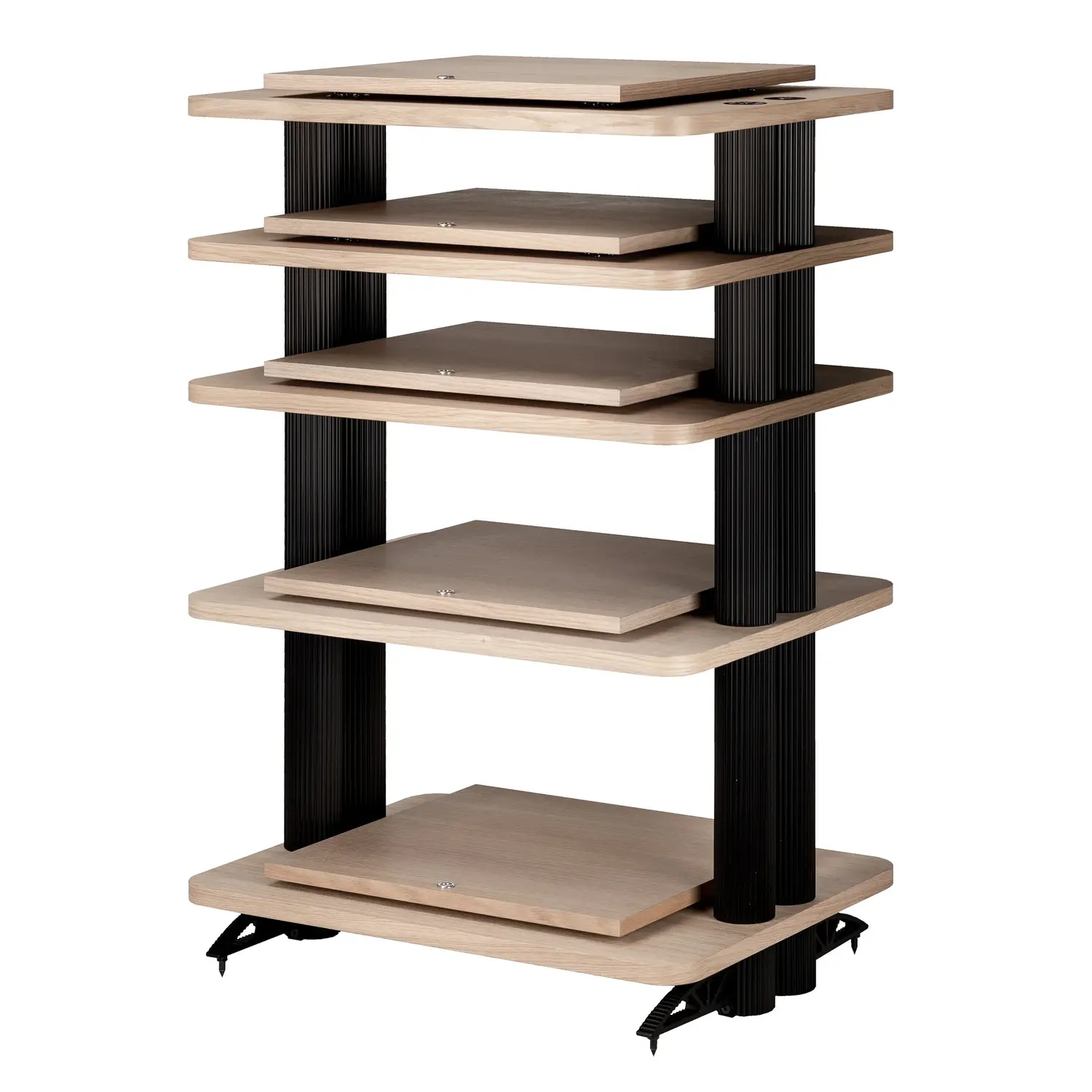 Balance with its retracted corner pillars are designed to primarily give as much highlight to the equipment as possible. The shelves are made of waxed oak to preserve the natural wooden feel and corner posts in black or silver anodized aluminum.