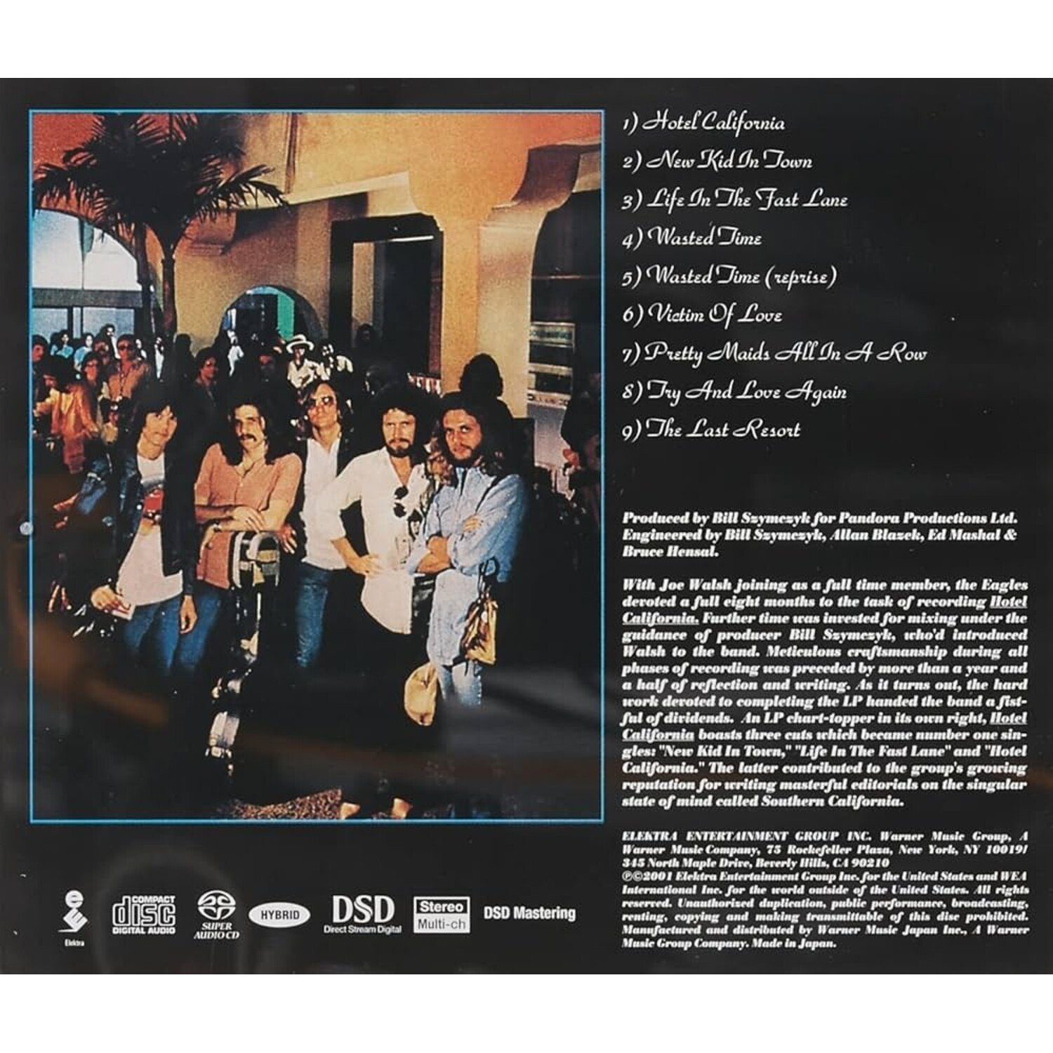 Japanese SACD-Hybrid pressing. American rock band the Eagles are one of the biggest-selling bands ever. Their catalog of country-tinged songs have found their way to the upper reaches of the charts and their seminal album, the 16-times platinum Hotel California, is ranked 37th in the Rolling Stone list of the 500 Greatest Albums of All Time. Features the title track smash, as well as "New Kid In Town," and "Life In The Fast Lane."