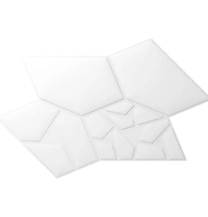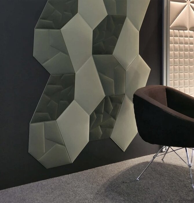 Presented in 3 pieces each of four different shapes (12 pieces total), these moss green-colored fire-rated Vicoustic GEN_VMT PENRAY 02 Tiles are acoustic panels that can be combined for an interesting look whilst absorbing medium and high frequencies. Based upon geometric research in fields of pentagonal tiling, where each individual piece is in the shape of a pentagon, the tiles allow you to build your own patterns from simple to complex. In this exploratory work, Vicoustic was looking for a shape grammar that allows generating endless combinations of single or double main shapes.