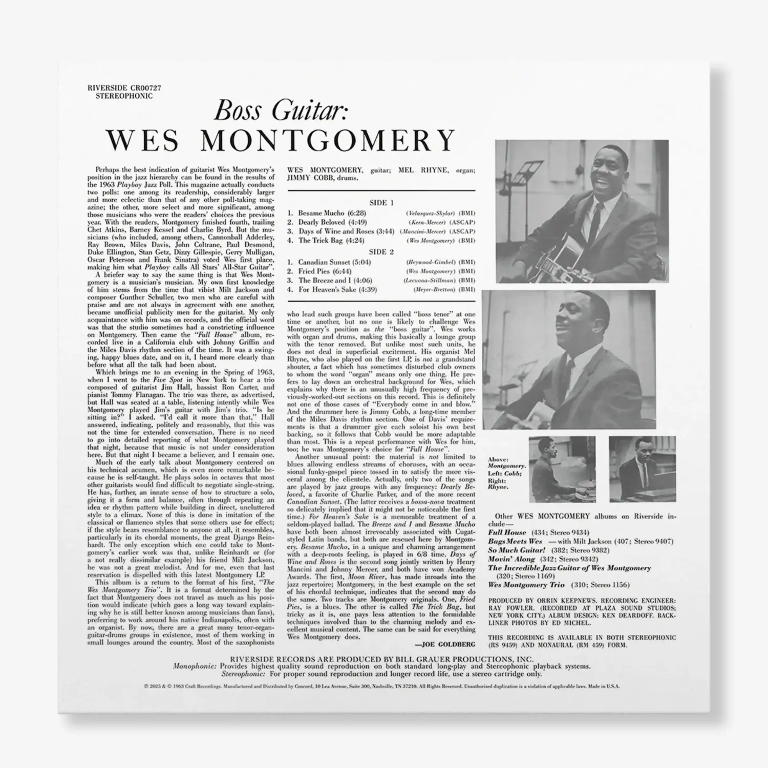 Originally released in 1963, Boss Guitar is the 8th album from influential and prolific jazz guitarist Wes Montgomery. Released on the legendary Riverside label it also features Melvine Rhyne ( organ ) and Jimmy Cobb ( drums ) across a selection of standards and Montgomery originals. This new edition of the album is released as part of the Original Jazz Classics Series on 180-gram audiophile grade vinyl pressed at RTI with all-analog mastering from the original tapes at Cohearent Audio and a Stoughton Tip-On Jacket.